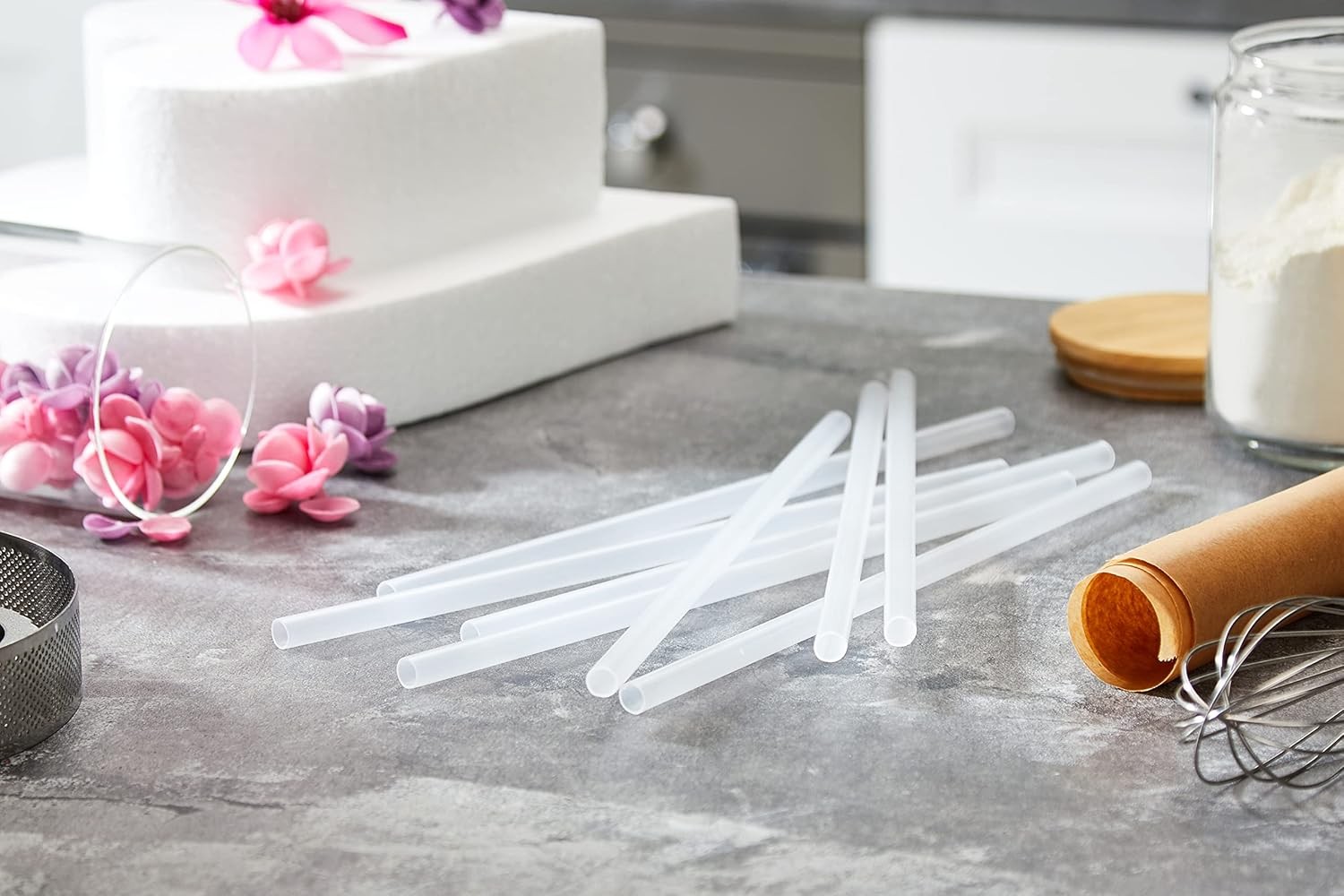 Con diametro di 0,4 cm e altezza di 30 cm, sono ideali per il montaggio di torte a piani, facili da tagliare, lavabili e riutilizzabili.