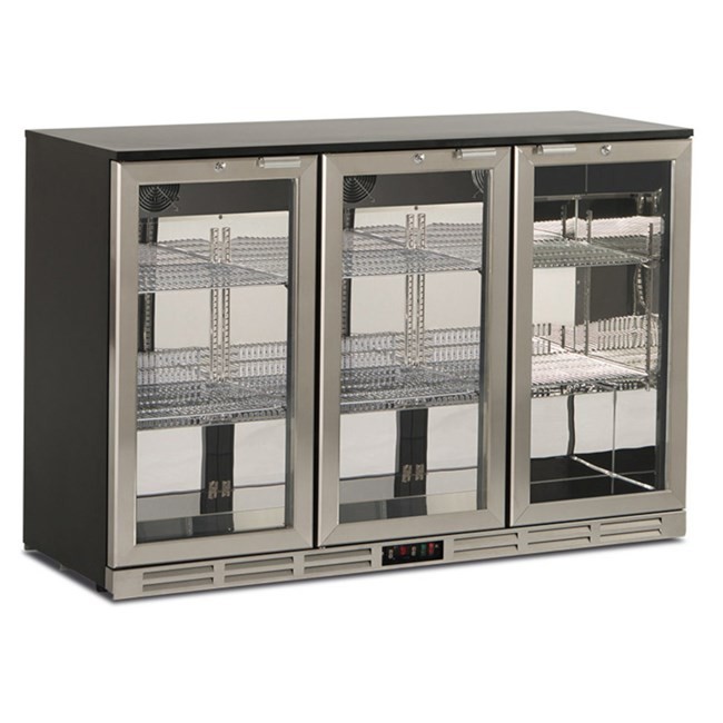 Vetrina refrigerata sotto banco Back Bar da 290 litri con 3 porte battenti e vetro, ideale per il raffreddamento e la conservazione di bevande e alimenti. Struttura robusta con interno in acciaio inox e isolamento spesso 5 cm. Regolazione elettronica della temperatura (0°/+10°C), luce LED interna e sistema di evaporazione automatica dell'acqua di condensa. Capacità interna ottimale con griglie cromate inclusi per una gestione efficiente dello spazio.