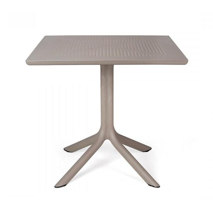 Il tavolo Clip di Nardi, in colore tortora, misura 80 x 80 cm con un’altezza di 75 cm.