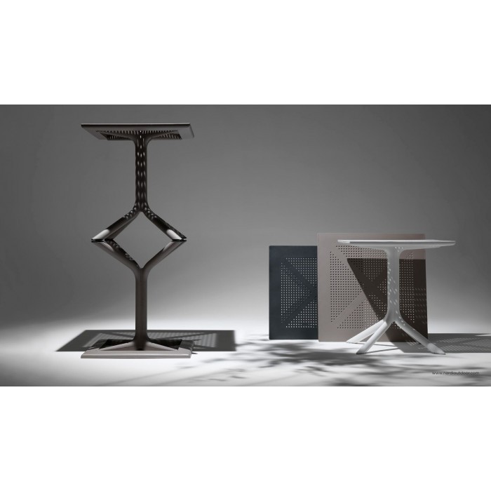 Realizzato in resina fiberglass riciclabile, è dotato di un piano DurelTOP foto-inciso con motivo bucherellato a rombi e una gamba centrale a quattro razze, perfetto per spazi interni ed esterni.