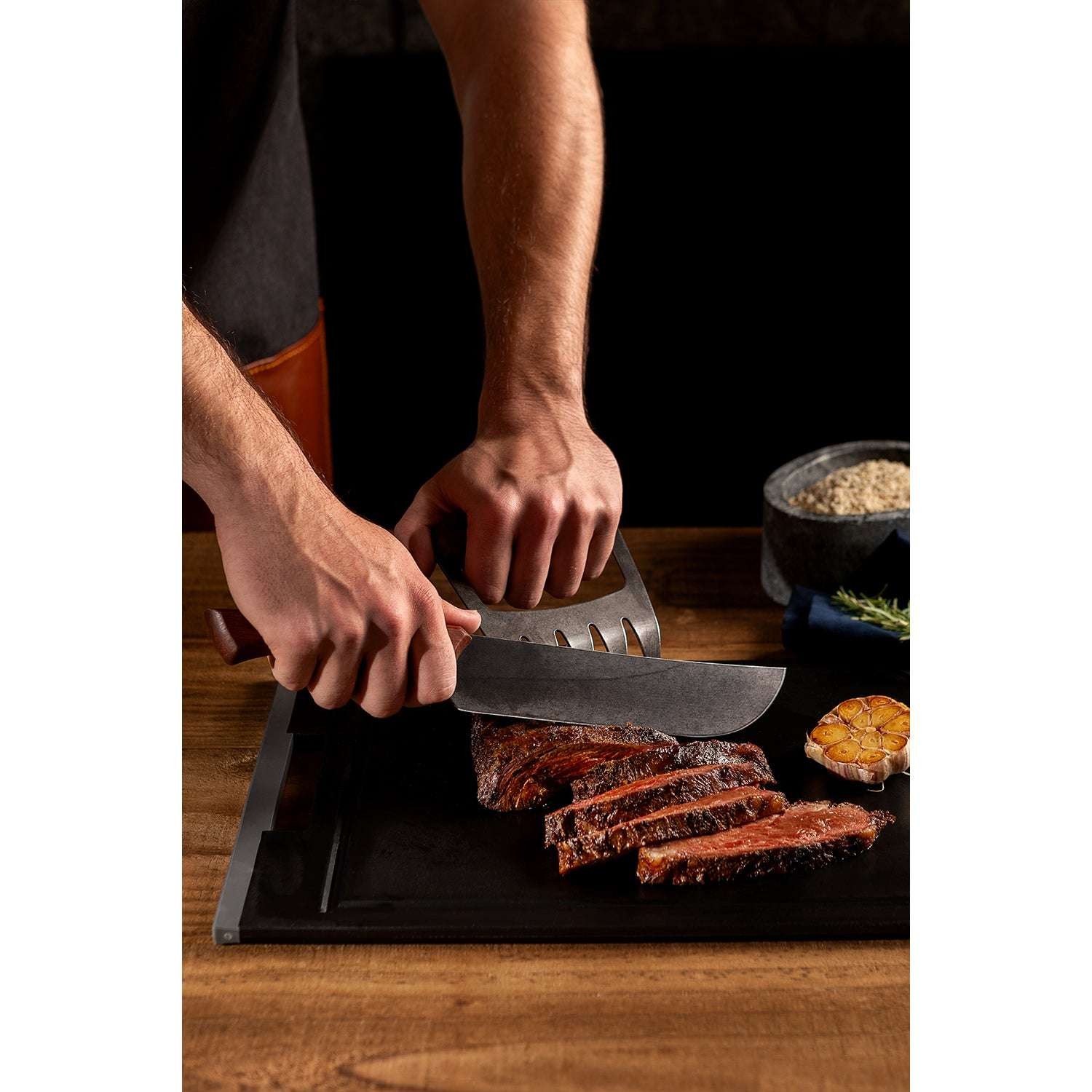 La lama rigida in acciaio inox brunito da 19,2 cm, larga 4,9 cm, assicura un taglio netto e deciso anche sulle carni più compatte.