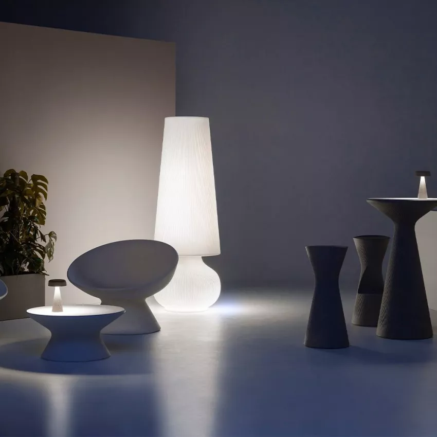 La lampada da terra Fade è un complemento d'arredo elegante, caratterizzato da una base rigata che crea un gioco di luci e ombre. Alta 140 cm e con finitura effetto pietra bianca, è realizzata in polietilene di alta qualità, 100% Made in Italy. Perfetta per ambienti indoor e outdoor, diventa un elemento scultoreo quando spenta e una fonte di luce accogliente quando accesa. Il kit luce è venduto separatamente.