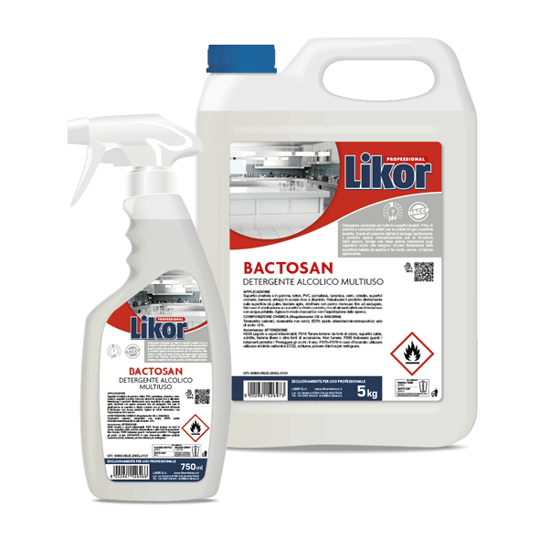 LIKOR BACTOSAN SANIFICANTE ALCOLICO MULTIUSO ML.750 HACCP PH.7 PRIVO DI PROFUMI E COLORANTI - RAPIDO ED EFFICACE - IGIENIZZA LE SUPERFICI TRATTATEDETERGENTE ALCOLICO IGIENIZZANTE PER TUTTE LE SUPERFICI LAVABILI. PRIVO DI PROFUMI E COLORANTI E' ADATTO PER LA SANIFICAZIONE DI CUCINE, SCUOLE, ALBERGHI, CASE DI CURA, GELATERIE, INDUSTRIE ALIMENTARI. ASCIUGA RAPIDAMENTE.