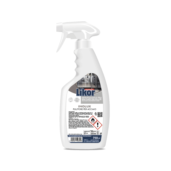 LIKOR INOLUX PULITORE PER ACCIAIO ML.750 HACCP PH.7,5 SPECIFICO PER SUPERFICI INOX - DETERGE E LUCIDA RAPIDAMENTE - RAVVICA LE SUPERFICI TRATTATEDETERGENTE SPECIFICO PER L'ACCIAIO INOX SATINATO E LUCIDO. RIMUOVE OGNI TRACCIA DI SPORCO E UNTUOSITA' LASCIANDO LA SUPERFICIE TRATTATA LUCIDA E PULITA. RIPRISTINA LA BRILLANTEZZA E ASCIUGA SENZA LASCIARE ALONI. RACCOMANDATO IN AMBIENTI ALIMENTARI E INDUSTRIALI.