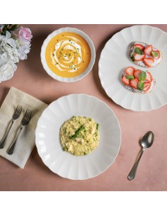 Il design innovativo con bordo a coste conferisce un tocco di eleganza e modernità, rendendolo ideale per la presentazione raffinata di primi piatti, zuppe e vellutate.