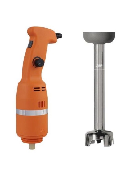 Il mixer ad immersione MK225 combina robustezza e versatilità per risultati professionali in cucina. Con un corpo motore in plastica antiurto, è progettato per resistere a un uso intensivo. Dotato di un potente motore ventilato da 250W e di un mescolatore da 250 mm in acciaio inox (modello MK025), offre una miscelazione efficace e duratura. Il variatore di velocità consente di adattare le prestazioni alle tue esigenze specifiche, mentre il vivace colore arancio aggiunge un tocco di stile al tuo spazio di lavoro. Alimentato a 230V, monofase, 50 Hz, è ideale per applicazioni professionali e domestiche