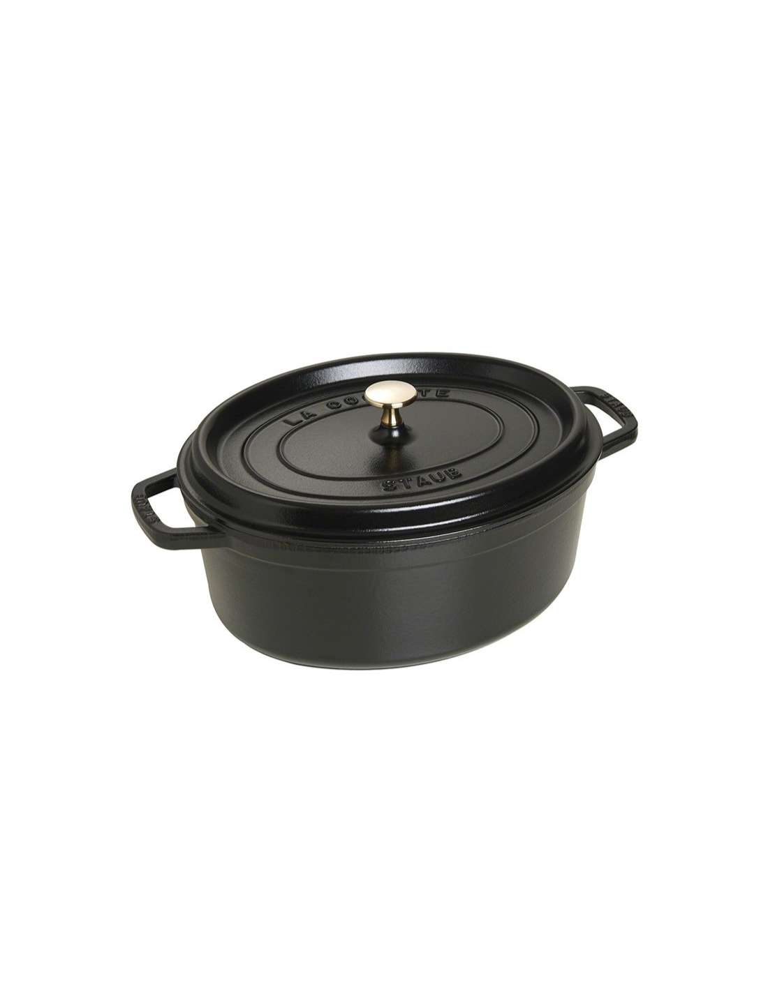 STAUBLa cocotte ovale in ghisa Staub 31 cm è un utensile professionale di eccellenza, pensato per il settore Ho.Re.Ca.. Grazie alla sua forma ovale e alla ghisa massiccia, garantisce una cottura uniforme e profonda per arrosti, brasati, pesci interi e preparazioni lunghe. Una presenza elegante anche in sala.