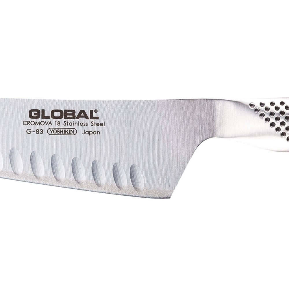 Il coltello cuoco oriental G-83 di Global, con lama alveolata da 18 cm in acciaio Cromova, è un utensile versatile, ideale per tagli di precisione su carne, pollame e verdure.
