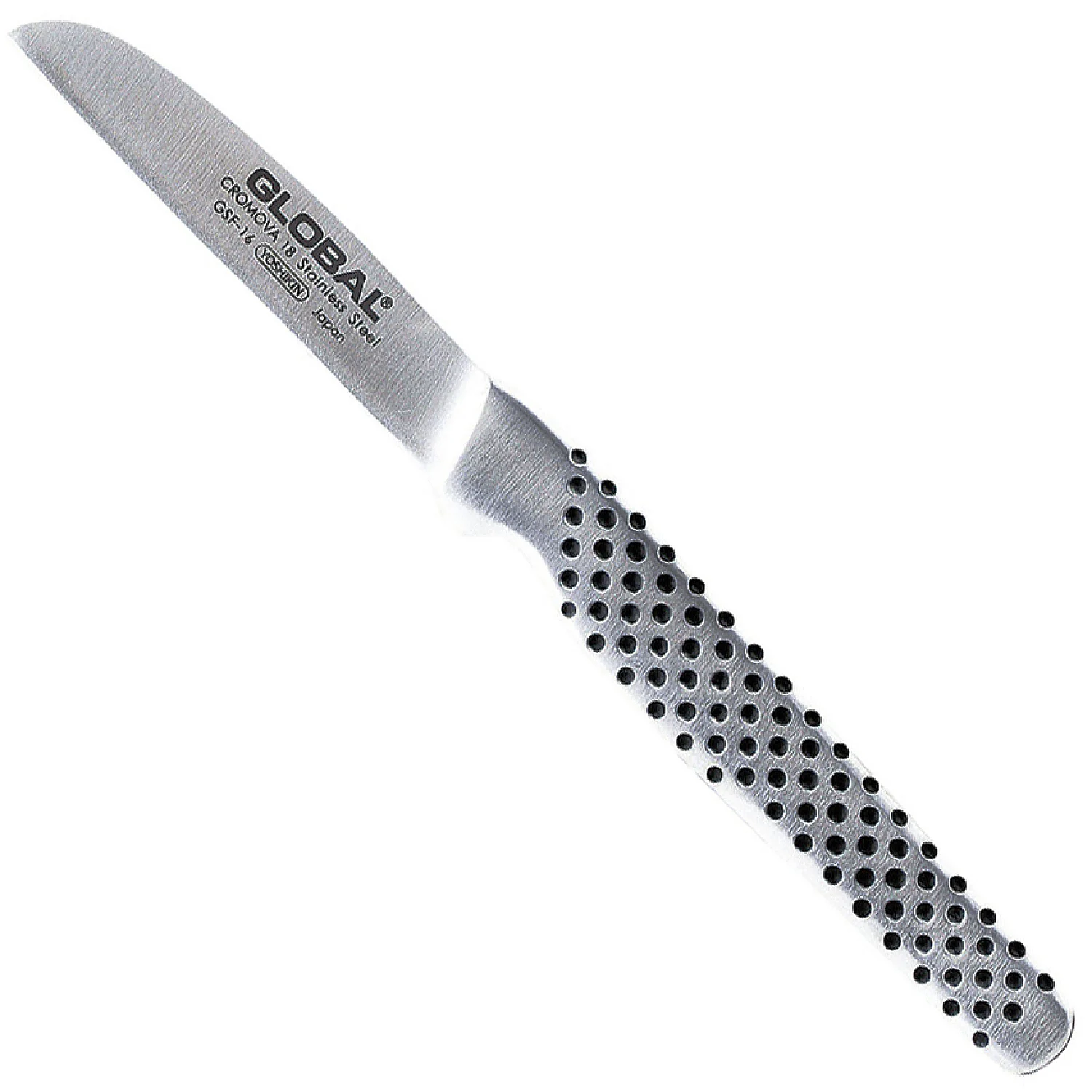 Il coltello spelucchino dritto GSF-16 di Global, con una lama da 6 cm in acciaio Cromova, è ideale per sbucciare e mondare frutta e verdure.