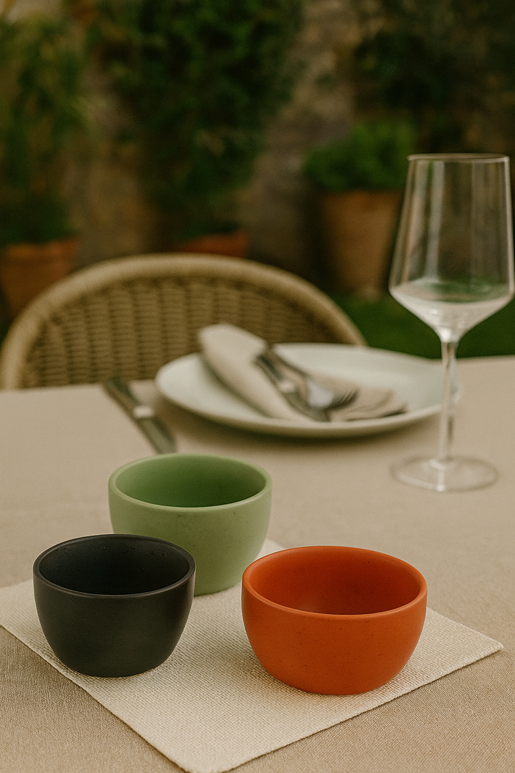 Un set di quattro coppette bombate Mexico da 10 cm di diametro, ideali per servire salse, antipasti o stuzzichini. Ogni pezzo è realizzato in porcellana resistente, disponibile in colori terrosi assortiti (verde salvia, terracotta, bianco e nero). Perfette per buffet ed eventi eleganti, uniscono design moderno e funzionalità.
