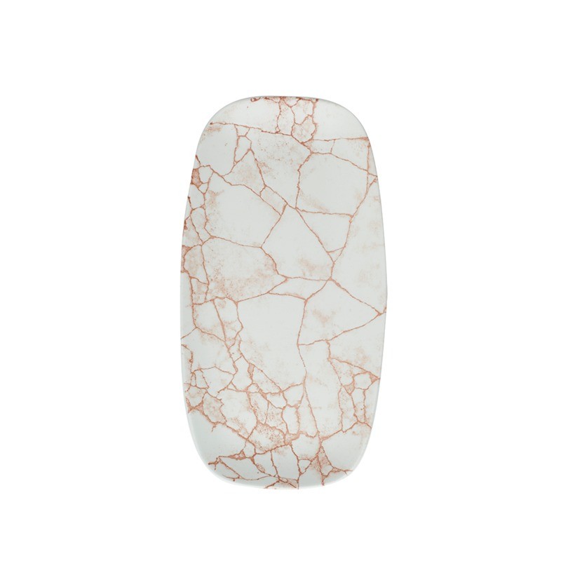 Il piatto rettangolare Churchill Kintsugi Coral in porcellana da 29,8 x 15,3 cm unisce design moderno e decorazioni ispirate al kintsugi. Perfetto per servire antipasti o dessert con eleganza.