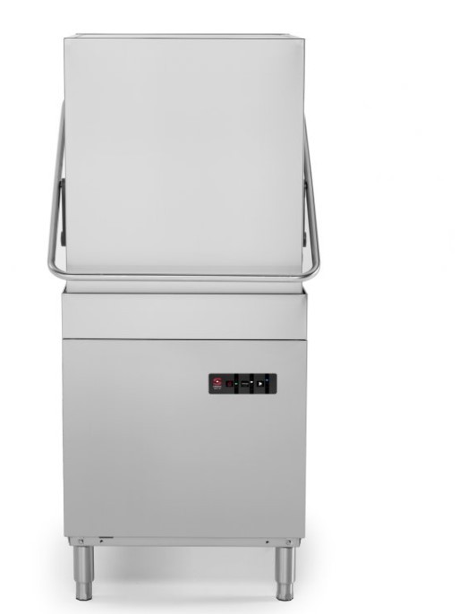 Lavastoviglie a capottina AX-100, capacità cestello 500x500 mm, potenza 6700W, consumo acqua 3L/ciclo, 3 cicli di lavaggio, produzione fino a 30 cestelli/ora.