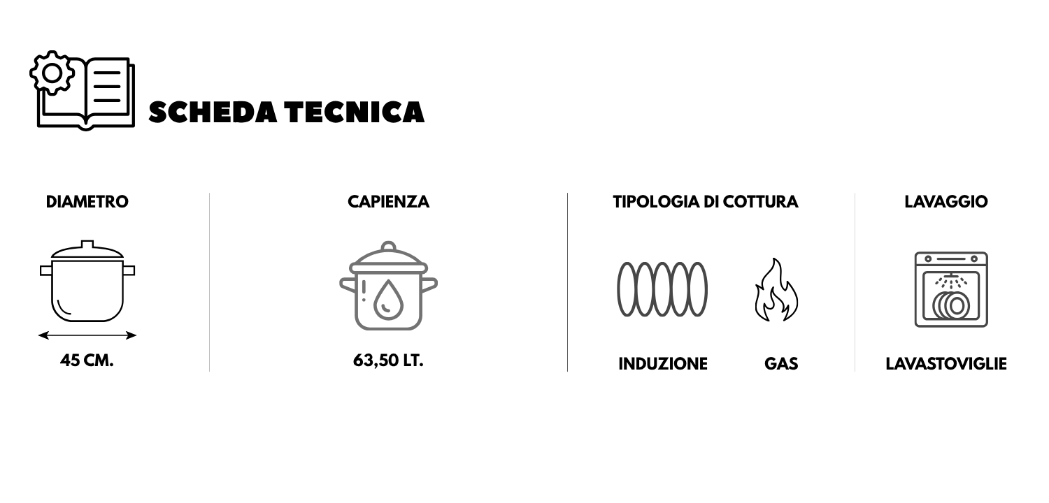 La Pentola Master di Pintinox da 45 cm e 63,5 litri di capienza è realizzata in acciaio inox 18/10 con triplo fondo acciaio/alluminio/acciaio, ideale per un uso professionale intensivo.