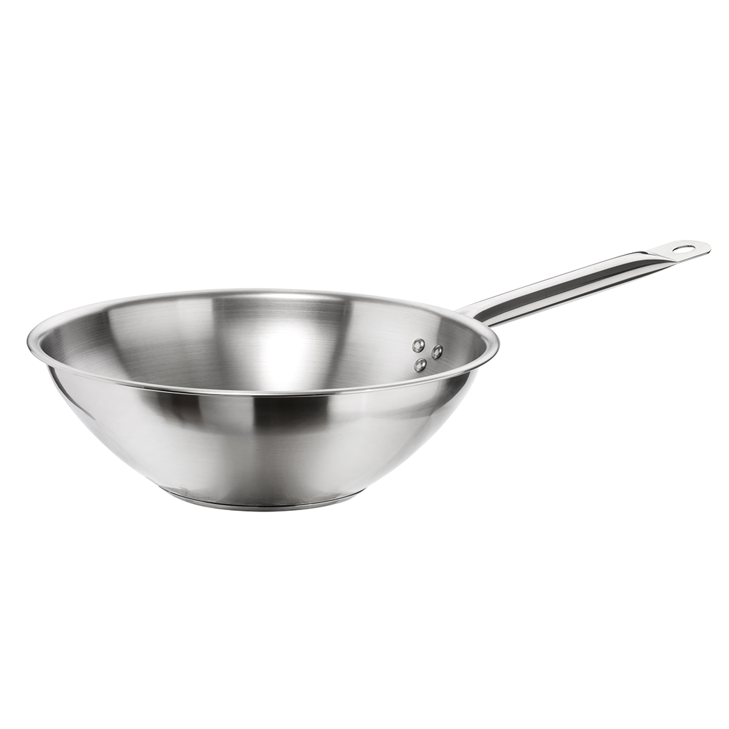 Il Wok 1 manico Master di Pintinox da 30 cm è realizzato in acciaio inox 18/10 con triplo fondo acciaio/alluminio/acciaio, ideale per una distribuzione uniforme del calore.