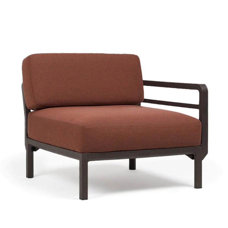 L’elemento terminale Maximo di Nardi, disponibile con bracciolo destro o sinistro, nei colori terra e cannella, è un componente versatile e sostenibile del divano modulare Maximo.