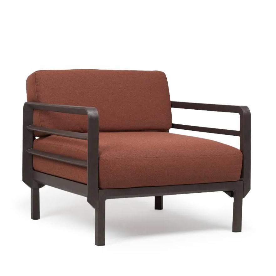 La poltrona Maximo di Nardi, nei colori terra e cannella, è un elemento versatile e di design, ideale per ambienti moderni.