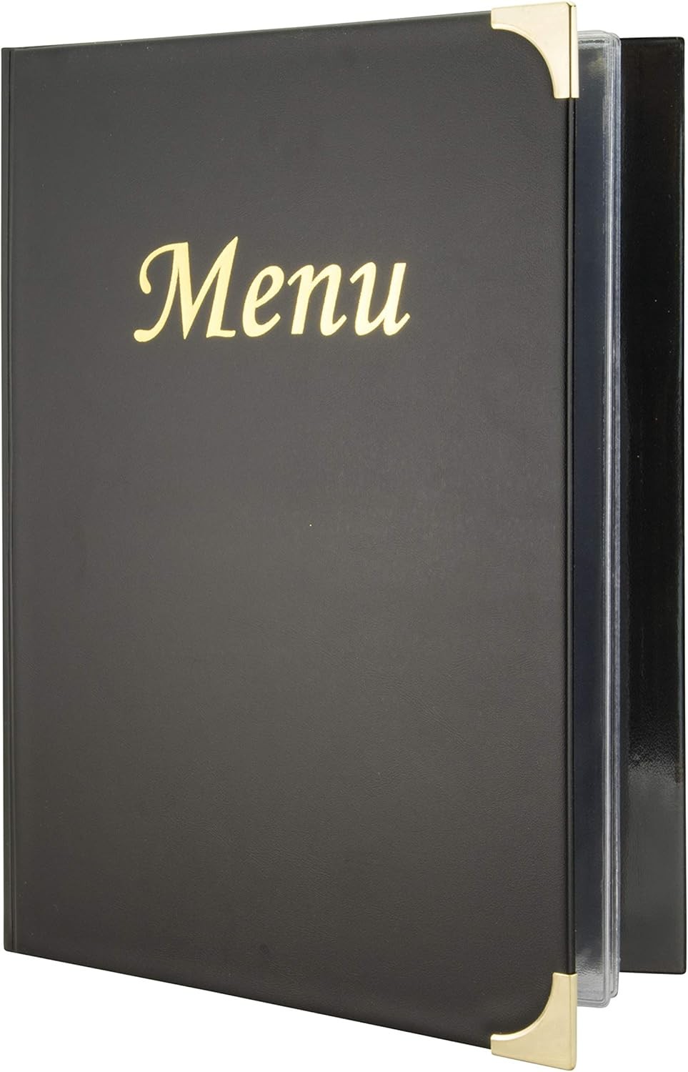 Il Portamenu Basic A4 di Securit in PVC nero misura 31,5 × 24 cm, con 10 pagine, scritta centrale e angoli color oro.