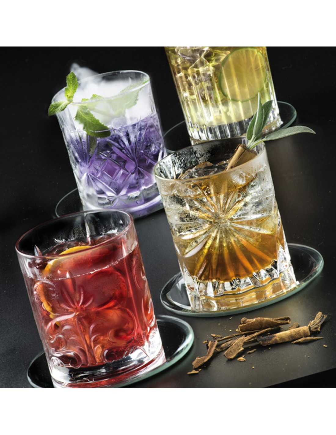 Il set di bicchieri DOF Mixology di RCR, confezione da 4 pezzi, include i modelli Tattoo, Oasis, Melodia e Timeless, realizzati in Luxion® Eco-Cristallo, il cristallo senza piombo più trasparente e brillante.