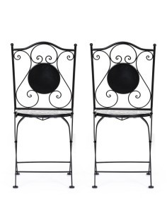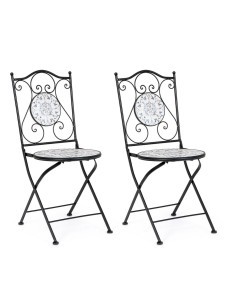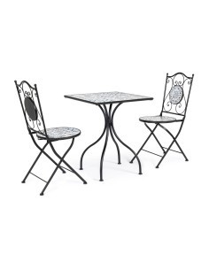 Questa sedia e tavolo da giardino uniscono resistenza e stile in un'unica soluzione. La struttura in acciaio trattato per l'esterno e verniciato a polvere epossidica offre durata nel tempo e protezione dagli agenti atmosferici. Il piano, la seduta e i decori in ceramica aggiungono un tocco di eleganza e garantiscono una superficie d'appoggio resistente. La sedia è pieghevole per una facile conservazione, mentre il tavolo richiede un'assemblea delle gambe. Con dimensioni di 38x38x92 cm per la sedia e 60x60x75 cm per il tavolo, sono perfetti per il tuo spazio esterno.