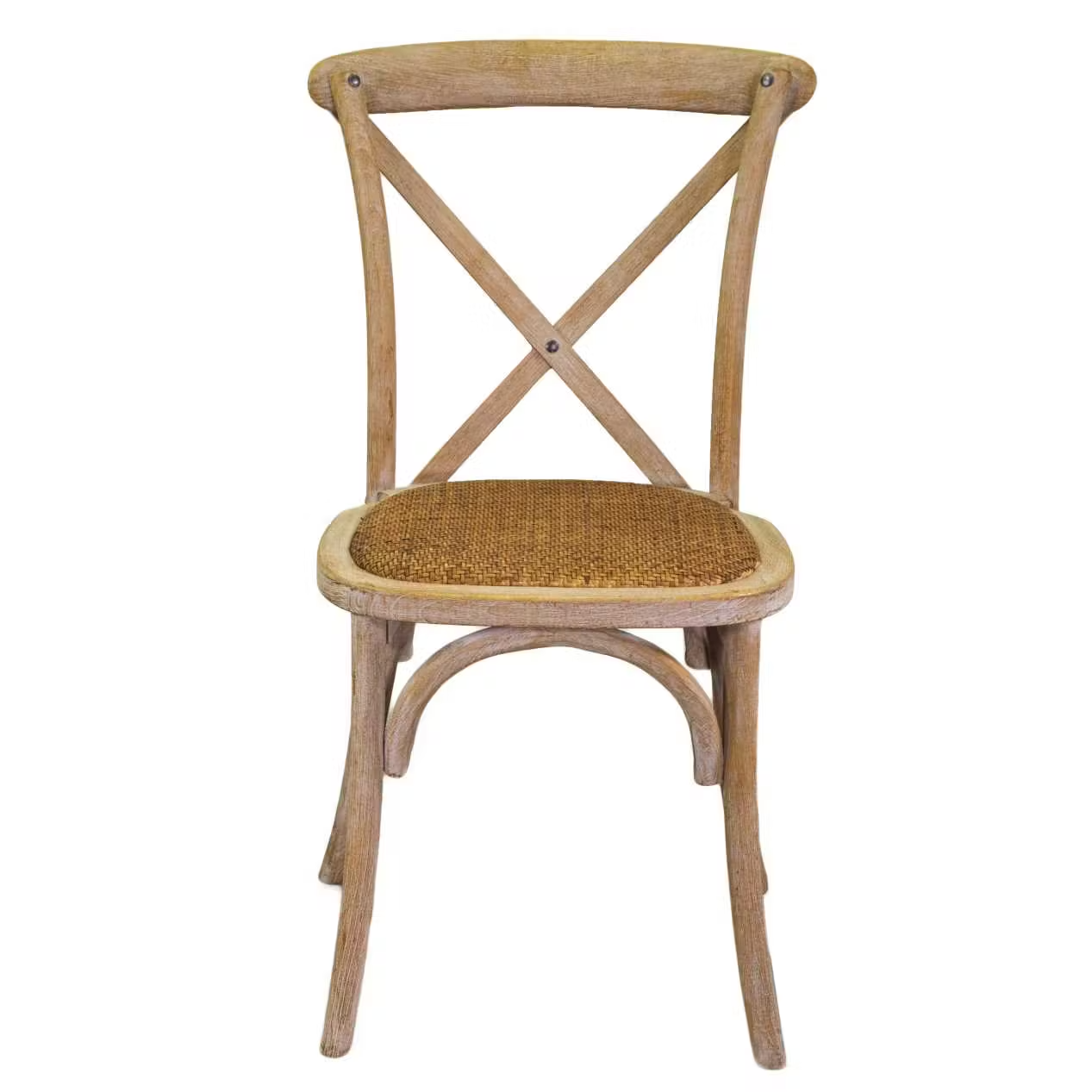 La sedia Cross di Vacchetti in legno di olmo naturale, con seduta in rattan, misura 51 x 55 cm con un’altezza di 89 cm. Elegante e impilabile, supporta fino a 125 kg.