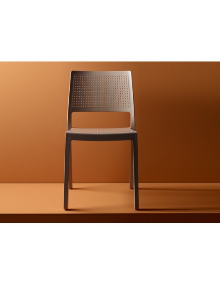 Aspetto sobrio, linee essenziali, comodità, la struttura interamente in tecnopolimero e i fori la rendono ideale per gli spazi outdoor, sia domestici che contract; la particolare forma delle gambe realizza una soluzione tecnica unica che ne consente l’impilaggio perfetto senza lasciare fughe, eccezionalmente stabile.