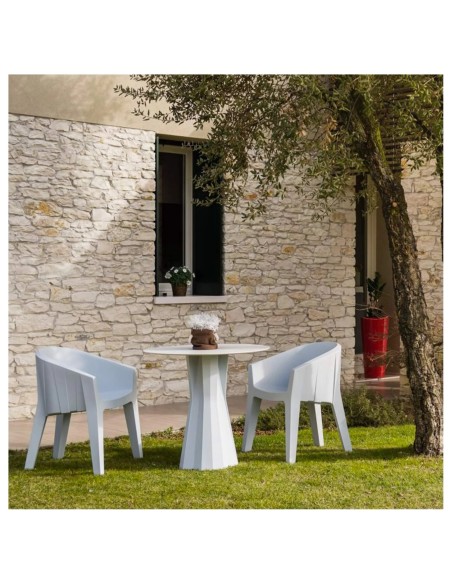 Realizzata in polietilene bianco, questa poltroncina confortevole si distingue per la sua superficie geometrica e il carattere versatile, adatta sia per l’uso indoor che outdoor.