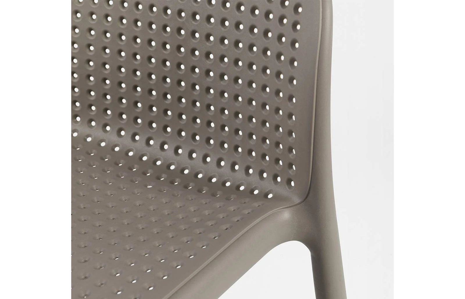 Materiale: polipropilene fiberglass trattato anti-UV e colorato in massa. Finitura opaca. Dotato di piedini antiscivolo. Altezza seduta 76 cm. Resina riciclabile.