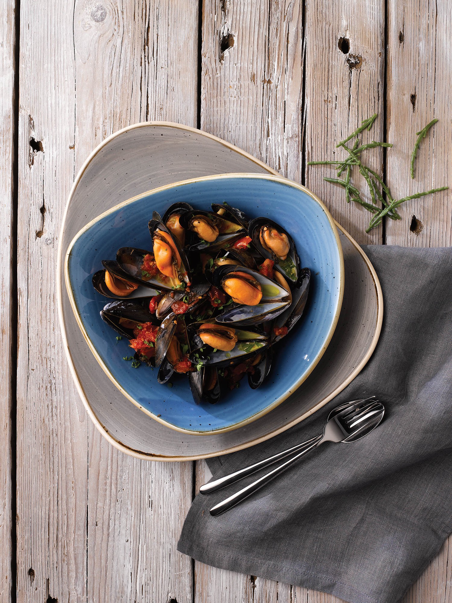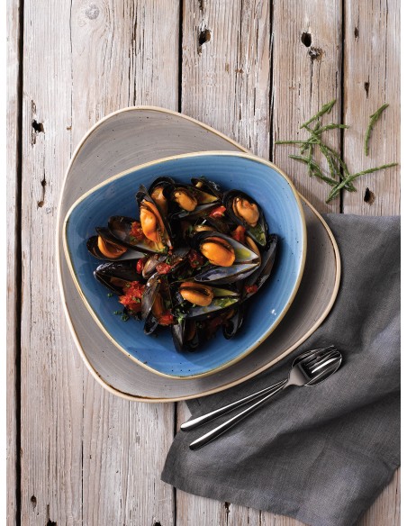 Il piatto piano triangolare blu Churchill Stonecast misura 23 cm ed è in porcellana di alta qualità. Ha un design moderno e rustico, ideale per antipasti o piatti principali. È lavabile in lavastoviglie e sicuro per il microonde.