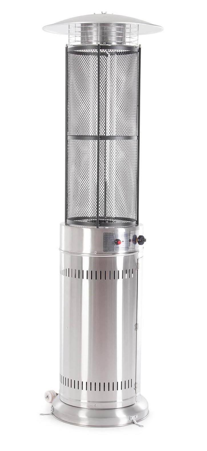 Con cilindro in vetro per una fiamma visibile, accensione a batteria e ruote per uno spostamento pratico.