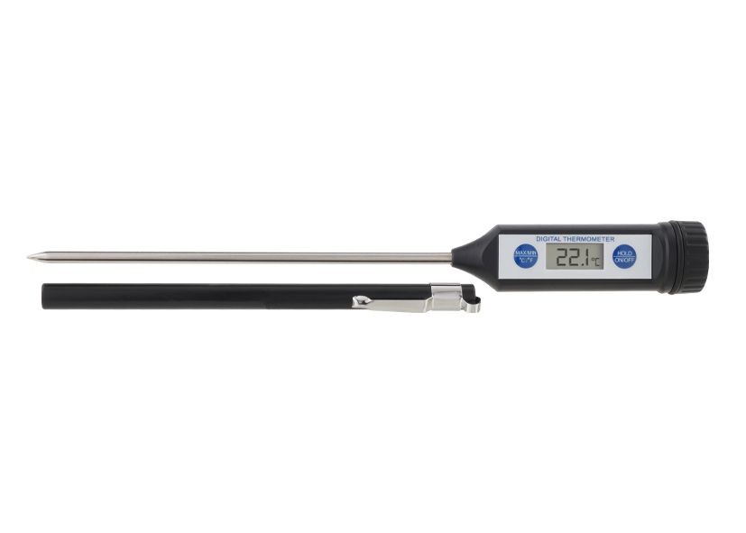 Termometro portatile con sonda in acciaio inox 18/10 da 12,5 cm e range da -50 °C a +200 °C, custodia con clip e batteria inclusa, lunghezza totale 20 cm.