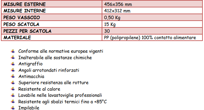 Con dimensioni 45,6 × 35,6 cm e un peso di 500 g, è impilabile e lavabile in lavastoviglie, perfetto per mense, catering e servizi collettivi.